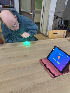 Op de foto’s is te zien dat we ‘Tik ‘m snel’ aan het spelen zijn; een computerspel voor het trainen van aandacht, motorische vaardigheden en (bij 2 of meer spelers) samenwerking. De gebruiker moet op de Cosmoid drukken met dezelfde kleur als het blok dat naar beneden valt op het scherm. Er wordt veel plezier beleefd met de Cosmo.